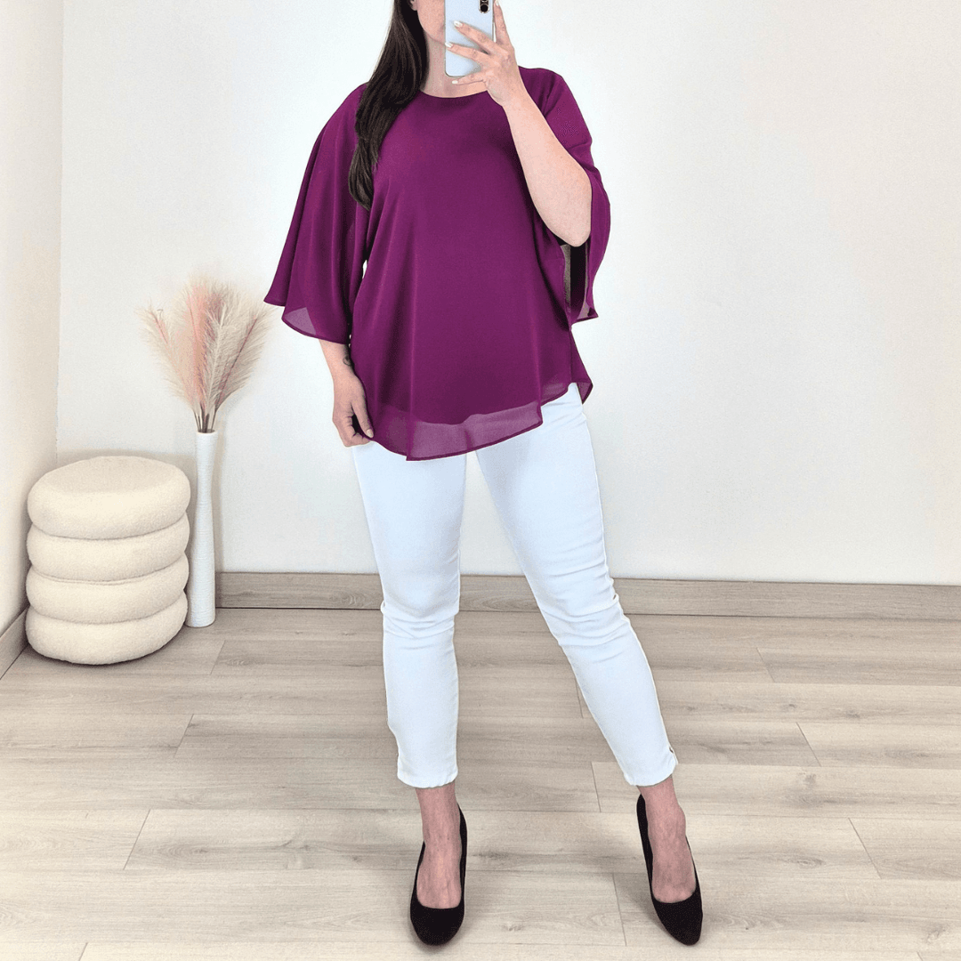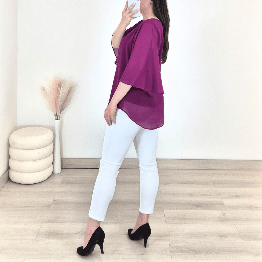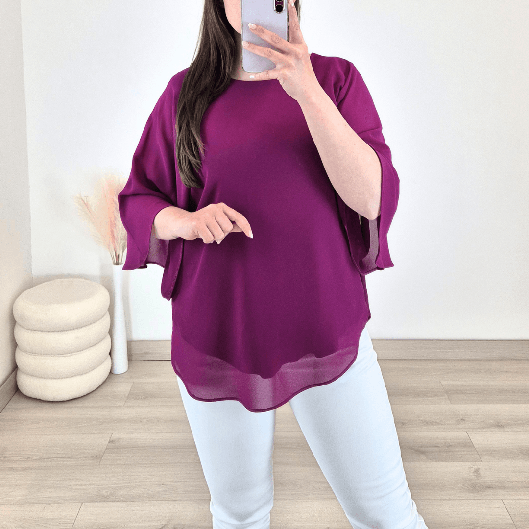 Ženska elegantna tunika oziroma podaljšana bluza Julija z asimetričnim muslinom, ki je pritrjen na osnovo. Zelo je primerna tudi za močnejše postave. Dolžina rokava je 3/4.Tunika je v ciklamni barvi, osnova pa v temno modri. Na voljo v velikostih od 38 do 50.
