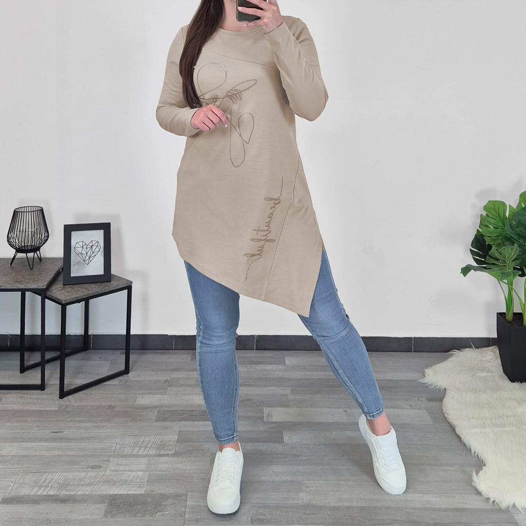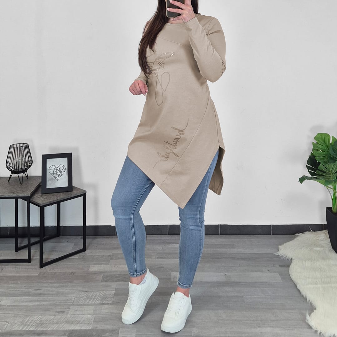 Modna tunika Lita v bež barvi. Tunika ima dolga rokava in je asimetričnega kroja. Na sprednji strani jo krasi tisk ženskega obraza in napis. Izdelana je iz kvalitetnega bombaža in je prijetna za nošenje. Na voljo je od številke 40 do 50.