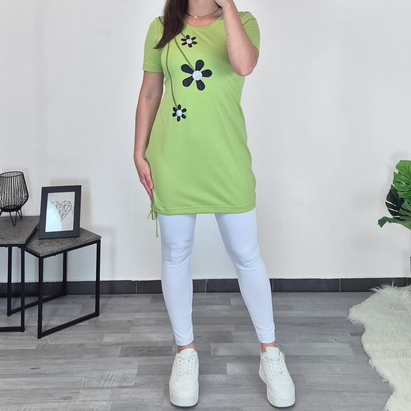 Modna bombažna tunika Sendi v svetlo zeleni barvi. Tunika je izdelana iz kvalitetne mešanice bombaža in elastana. Ima kratka rokava. Tuniki je na koncu dodana vrvica, s katero lahko nastavite širino po svoji želji. Na sprednji strani je kombinirana s koščki blaga v srebrno črni kombinaciji. Kroj tunike je primeren za vse postave, na voljo do številke 48.