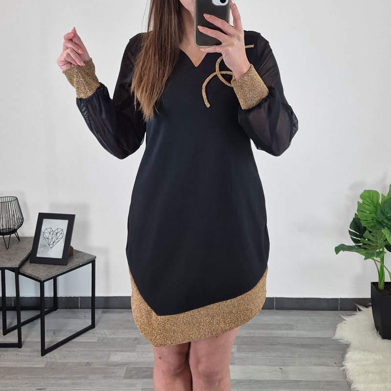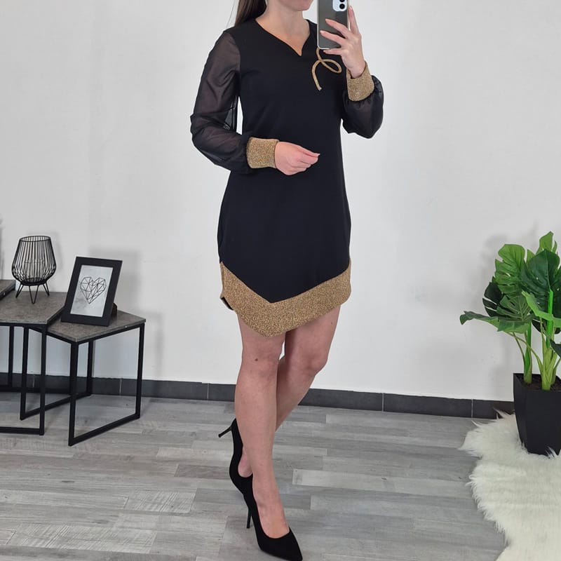 Modna tunika Tila v črni barvi. Tunika ima dolga in široka prozorna rokava, zaključena so s patentom. Krojena je rahlo navzven in rezana je asimetrično. Na spodnji strani in rokavih je kombinirana z zlatim blagom. Izdelana je iz kvalitetnega bombaža in je prijetna za nošenje.