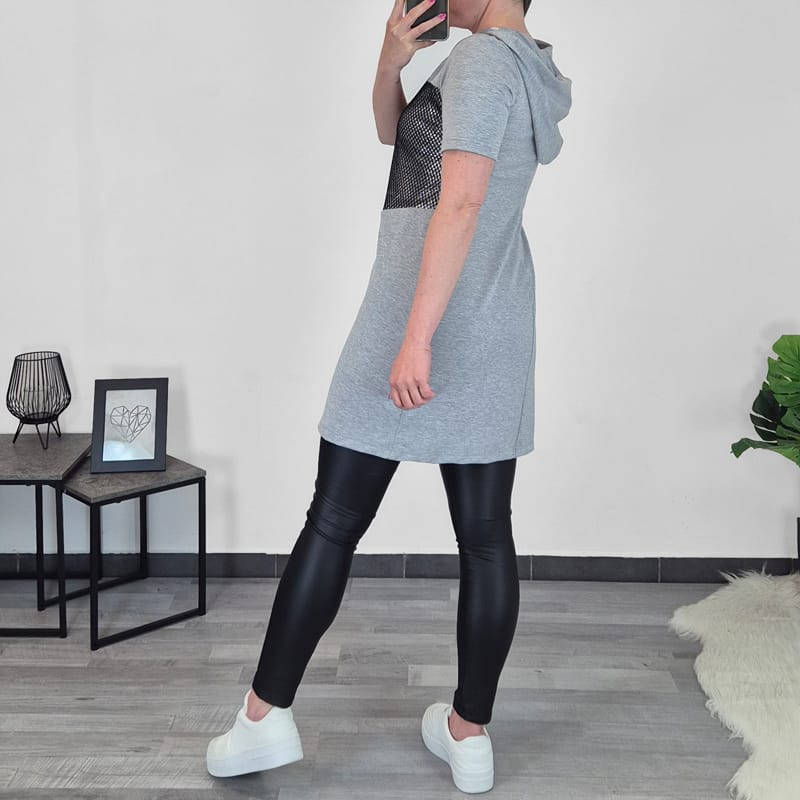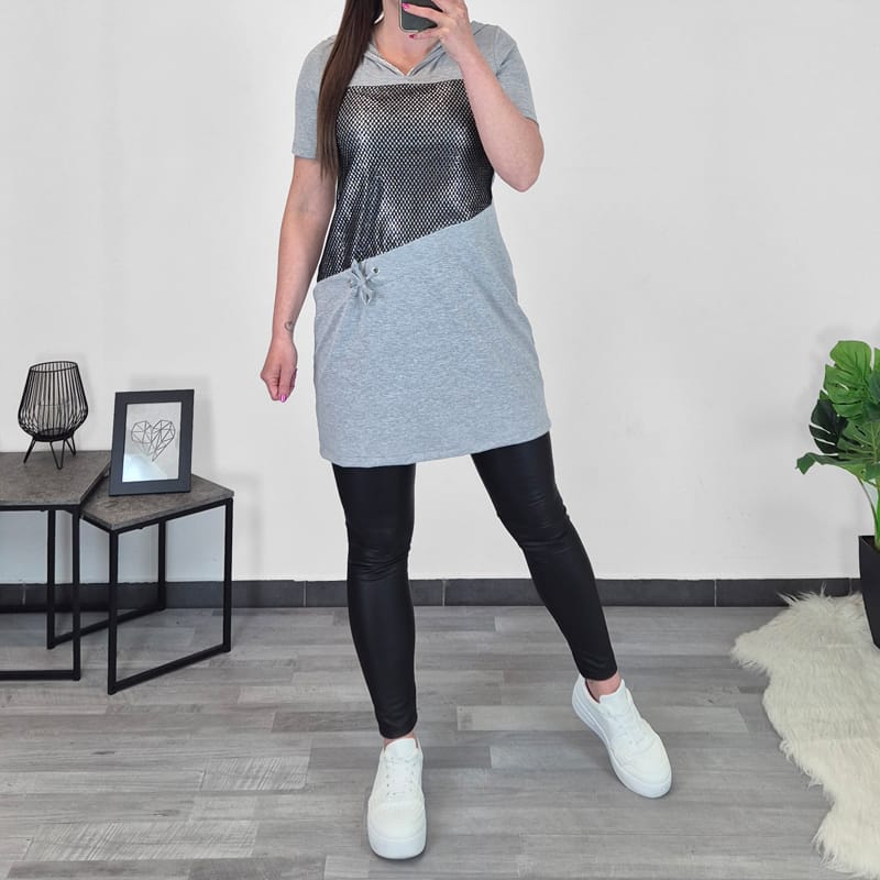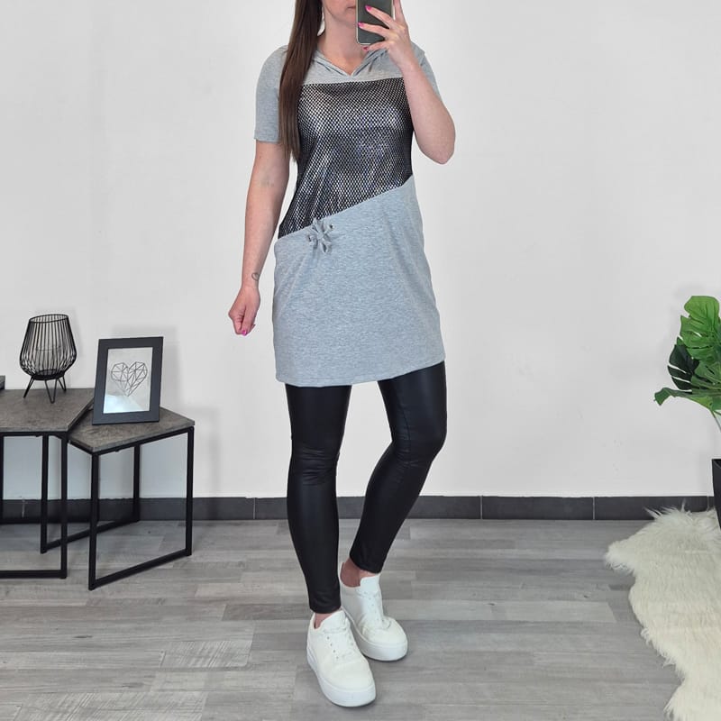 Modna tunika Vona v sivi barvi. Tunika ima kratka rokava in kapuco. Izdelana je iz kvalitetnega bombaža in je prijetna za nošenje. Na sprednji strani je kombinirana s srebrnim blagom in črno mrežico. Srebrno blago je dodano tudi na kapuci.