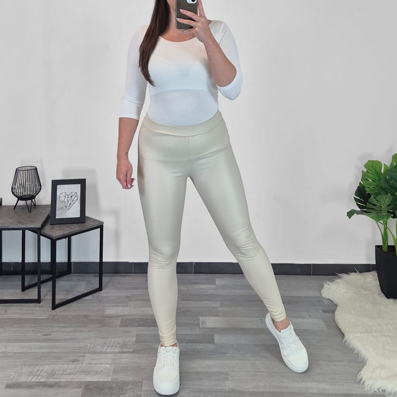 Rahlo kosmatene ženske pajkice v videzu usnja, v bež barvi. Pas je visok in širok in se odlično prilega telesu. Pajkice so narejene iz elastičnega materiala in so udobne.