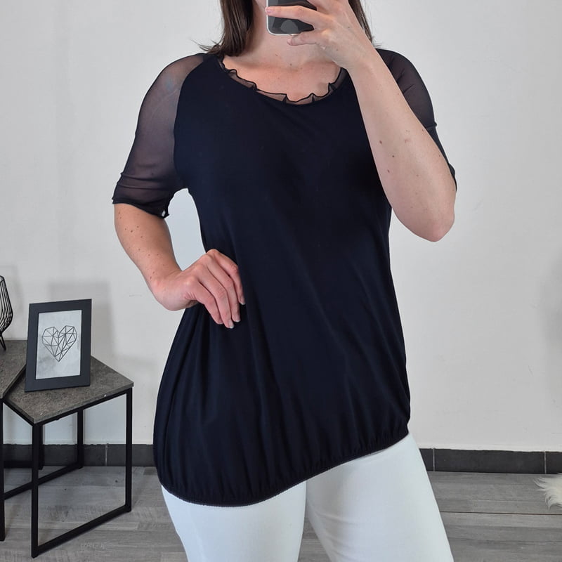 Elegantna viskozna majica Karin v temno modri barvi. Majica je zelo elegantnega videza, saj ima rokava izdelava iz temno modrega tila. Til je prav tako dodan okoli ovratnika. Kroj majice je širši, spodaj pa je dodana elastika, ki se lepo prilega telesu. Majica je izdelana iz kvalitetne viskoze. Na voljo je od številke 40 do 50.