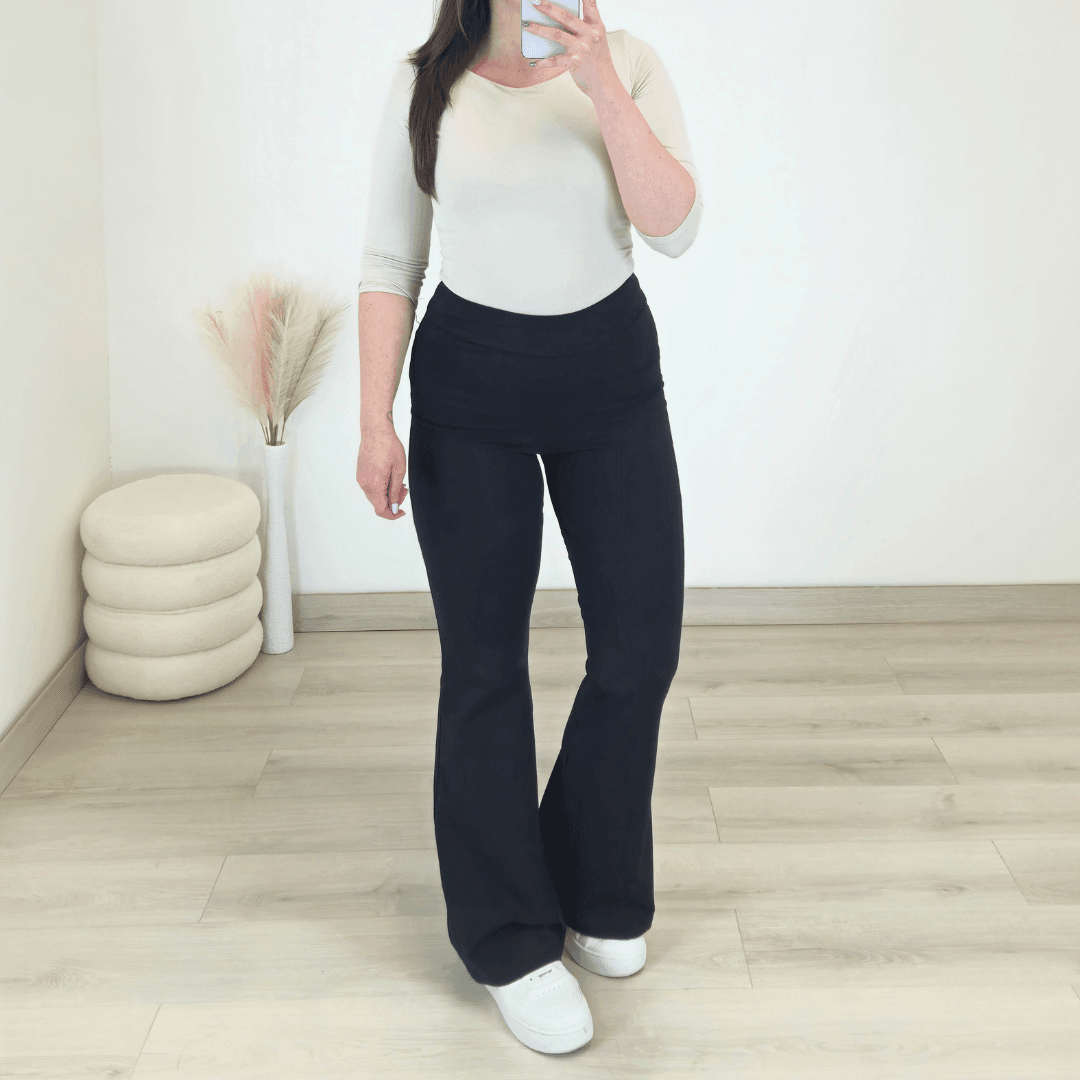 Bombažne hlače Everi v črni barvi. Hlače imajo višji pas na elastiko. Hlačnice so ozke v predelu stegen, spodaj so široke. Izdelane so iz kvalitetnega bombaža in pri nošenju ohranjajo svojo obliko. Na voljo so od številke 38 do 50.